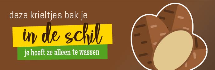 Krieltjes zijn kleine aardappeltjes tot ongeveer 30 mm groot. Deze krieltjes zijn niet geschrapt. Dat kun je eventueel zelf nog doen, maar dat hoeft zeker niet. Als je met schil en al bakt, heb je meer smaak, een lekkere bite en bovendien een mooi kleurcontrast wat er smakelijk uitziet.