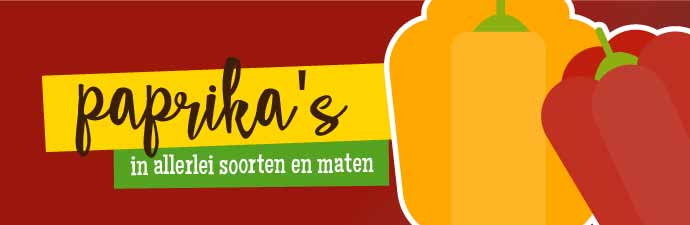 Wij hebben natuurlijk de bekende driekleuren-paprika’s. Gelukkig verpakken wij die niet in een plastic zakje, maar gewoon in papier. Dat extra plasticverbruik is namelijk helemaal niet nodig. Maar bij ons hoef je je niet per sé aan die drie kleuren te houden. Je kunt elke kleur paprika los bestellen, van de zoete oranje en rode paprika tot de kruidige groene paprika. Voor onderweg en op school hebben we zoete, knapperige snackpaprika’s. Met de zoete puntpaprika kan je eindeloos variëren. Lekker door de salade of voor in sauzen en soepen.
