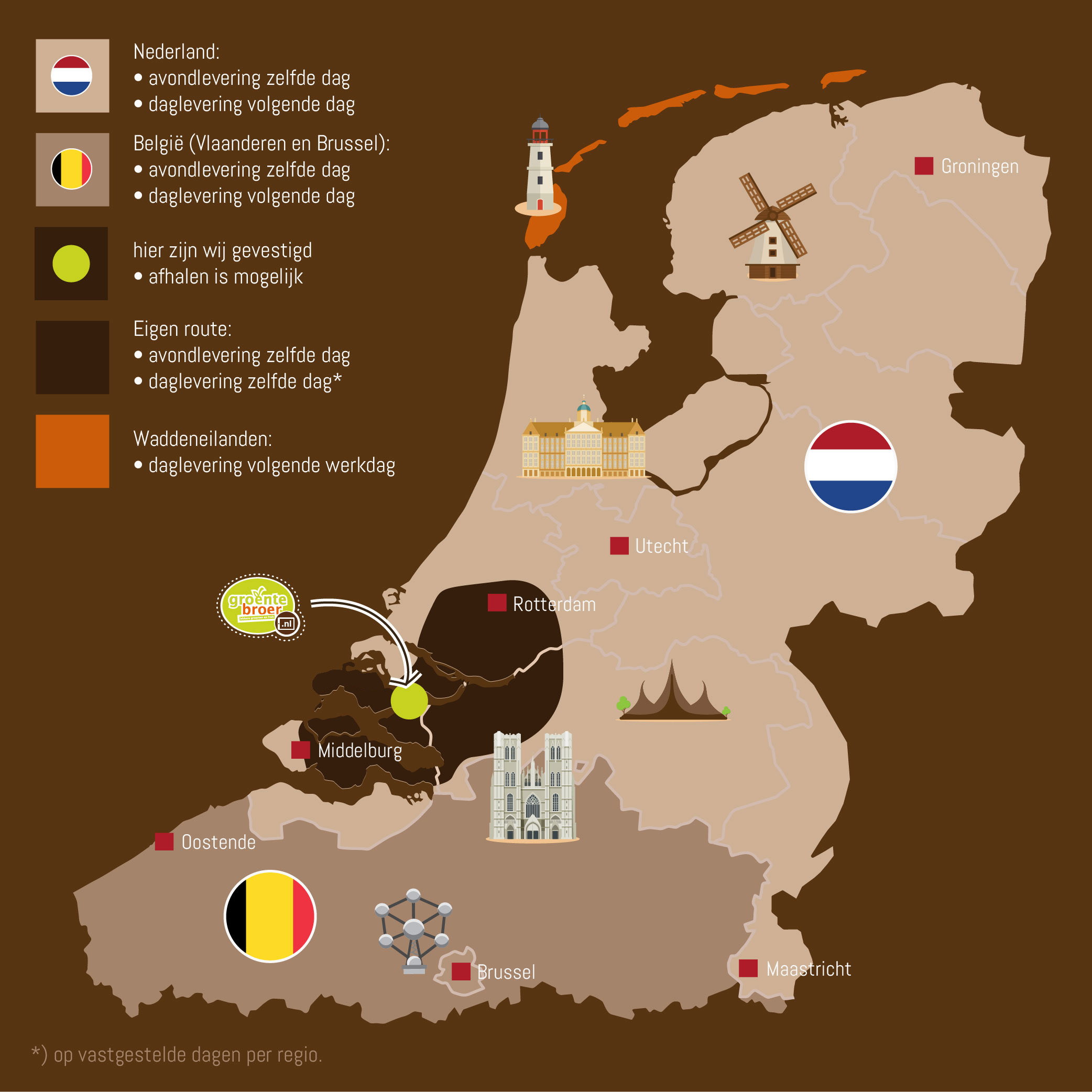 Wij leveren van dinsdag tot vrijdag door heel Nederland en in een groot gedeelte van België (heel Vlaanderen en Brussel).